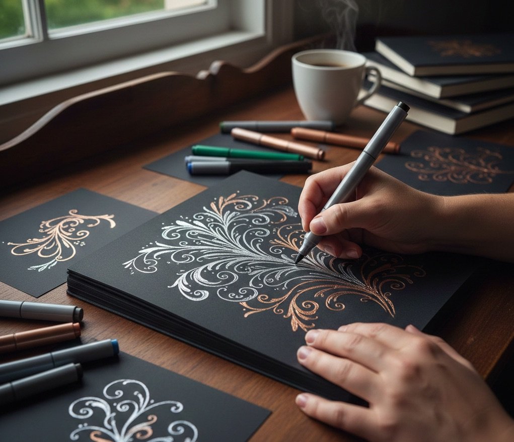 Artists often describe this process as grounding. The dark background creates a sense of calm, a visual quiet that allows metallic lines to breathe. Whether you’re filling a sketchbook spread or creating small luminous studies, metallic art encourages you to slow down and savor the act of drawing.