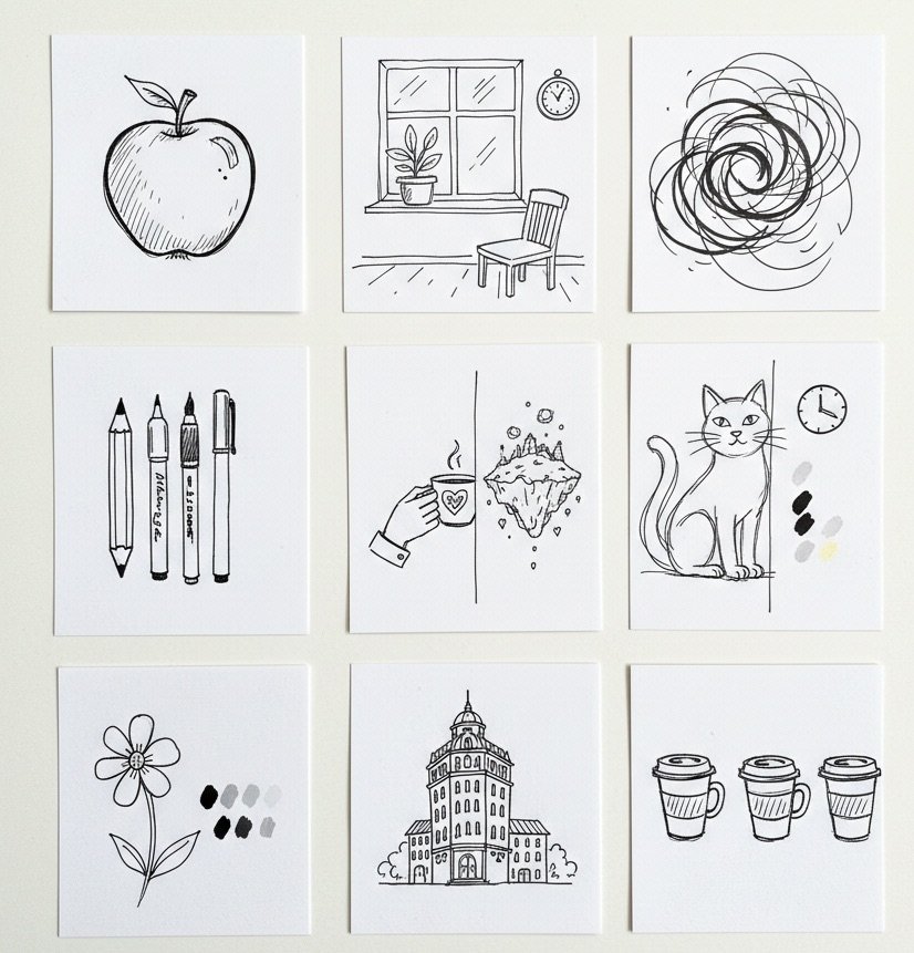 In this curated exploration, the sketchbook becomes a gallery of possibilities. Each idea is presented not as an instruction, but as an observation of what artists often find compelling when they begin: simple forms, expressive marks, everyday objects, and scenes that invite quiet attention. These early sketches create momentum, offering a creative jump start that builds confidence and nurtures artistic identity.